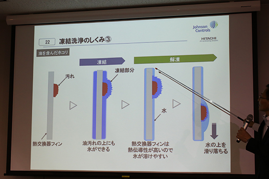 「エアコンのセンサーで人がいないことや汚れ具合をみながら、熱交換器を凍らせて自動洗浄する」。日立ジョンソンコントロールズ空調(日立)の国内商品企画部の丸山裕部長は、この冬の主力モデルとなる「ステンレス・クリーン 白くまくん」プレミアムXシリーズに新搭載した「凍結洗浄」について説明する。
