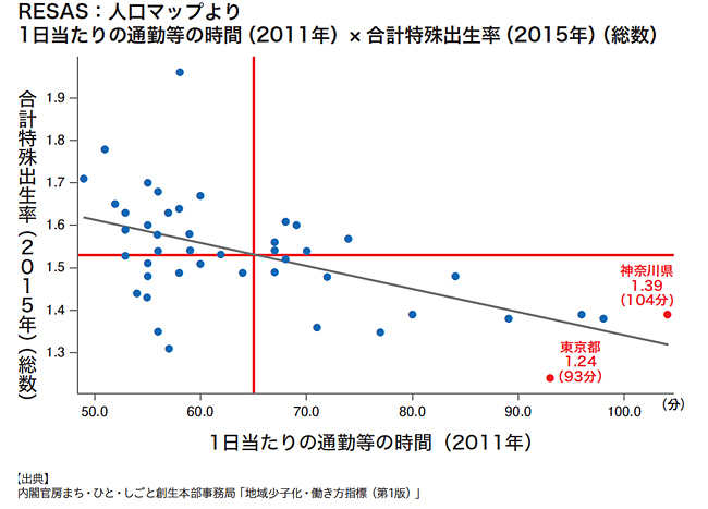 通勤時間の長さと、1人の女性が生涯に産む子どもの数を示す「合計特殊出生率」は相関性があると知られている。「RESAS」の「働き方関係等指標で分析」で示される分布グラフを見ると、一目瞭然だ。