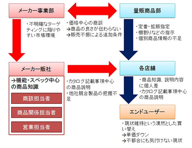 結果として、メーカー販社から家電量販企業までが「売る商品」ありきでの商談になる。商品知識やライフスタイルの変化の把握、接客術は販売員の個人の技量に任されるため、顧客ニーズとのギャップが大きくなるのだ。