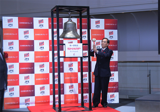 シャープは12月7日、東証1部に復帰した。2016年8月の2部への降格から1年4か月のスピード復活となる。上場通知書の贈呈式を終えたセレモニーで、戴正呉社長は勢いよく鐘を鳴らした。