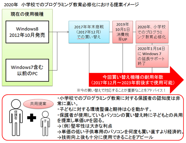 一部統計では、20年の小学校でのプログラミング教育必修化について、90%近い認知度があるとされている。しかし、顧客が商品を選択する際に「子ども」に照準をあわせると、「子どもが使うなら安いPCでいいだろう」という発想になり、低単価PCが「世帯使用のPC」になりかねない。PC市場はますます縮小する。