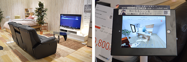 インテリアや雑貨は半年前にオープンした新業態の店舗と同様、具体的なシーンを提案しながら家電とインテリアをセットで展示。「間取リッチVR」のようなテクノロジーを駆使した仕掛けも取り入れている。
