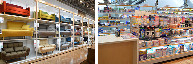 ソファやベッドなどの家具は床面だけでなく壁面にも3段で展示し、品数の豊富さをアピール。レジ周りは医療品や化粧品を充実させた。