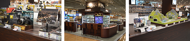 特に力が入っていたのがカメラコーナー。ひとつの商品のスペースを贅沢に使い、商品の作例を展示するなど高級感溢れる売り場になっている。試し撮りができるジオラマやフォトマスターが常駐するレンズバーを設けるなど、商品を選ぶだけではない工夫もある。