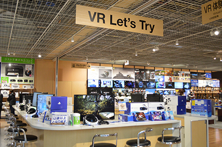 また目を引いたのは、エスカレーター前のVRコーナー。一つの島を丸ごと使って、PlayStation VRからスマホ用VRヘッドセットまで幅広く体験できるようにしていた。大手家電量販店ではあまり見かけないレベルの規模だ。
