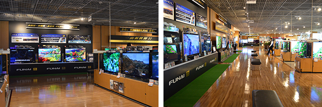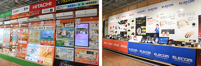 家電販売エリアで全体を通して印象的だったのが、大型什器だ。なかの商品展示エリアではノイズを極力減らしてすっきりとさせている分、壁面の什器は情報量がたっぷりだ。