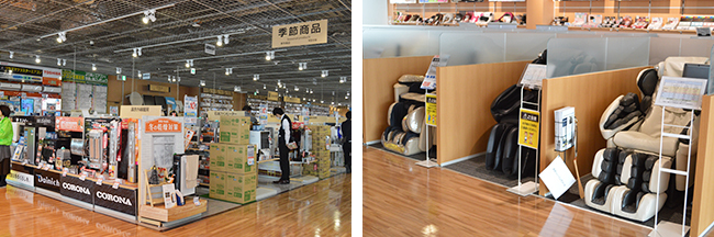 1階の正面入口前は季節家電を配置。マッサージチェアはパーテーションで区切っている