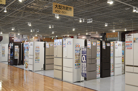 業態転換の影響で家電自体のエリアは縮小しているが、そこは展示品のカラバリを減らすことでカバーする。例えば、これまで2色すべてを展示していた冷蔵庫を1色に減らし、他の1色はサイズ違いのモデルで展示。顧客のデメリットにはならないように気を配りつつ、スペースを節約する。