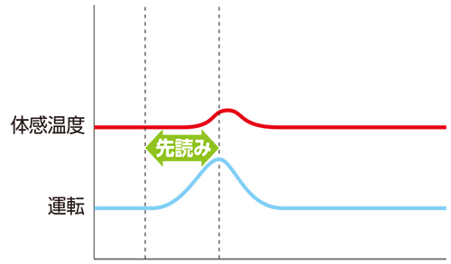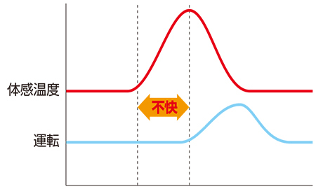 体感温度と運転のタイムラグで不快感が生じる(図は冷房時)