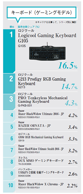2017年10月のピックアップカテゴリは、「ドライブレコーダー」「ゲーミングキーボード」「ゲーミングマウス」「SIMフリースマートフォン」「ノートPC」「4K液晶テレビ」の6つ。「ゲーミングキーボード」の1位は、ロジクールの「Logicool Gaming Keyboard G105」。2位・3位は同じくロジクール、4位・5位にはRazer製品がつけています。