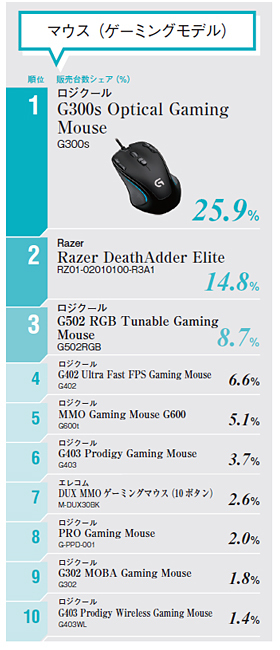 2017年10月のピックアップカテゴリは、「ドライブレコーダー」「ゲーミングキーボード」「ゲーミングマウス」「SIMフリースマートフォン」「ノートPC」「4K液晶テレビ」の6つ。ゲームプレイに適した「ゲーミングマウス」は、シェア25.6%を占め、ロジクールの「G300s Optical Gaming Mouse」がトップを獲得。2位はRazerの「Razer DeathAdder Elite」でした。