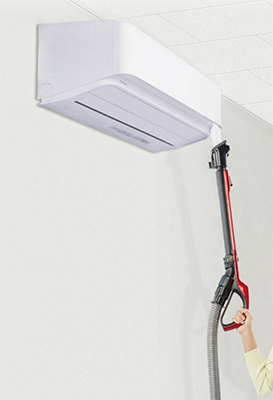 室内機の清掃性は、この冬の争点になっているが、「大清快」は掃除機で簡単に手入れできる独自の「楽ダストボックス」が売りだ。付属の掃除ノズルを掃除機の延長管の先端に取り付けて、ルーバー付近のごみの吸入口にあてる。すると、フィルターの自動掃除機構でダストボックスにたまったホコリを吸い込むことができる。ダストボックスを取り外す手間が不要なのだ。