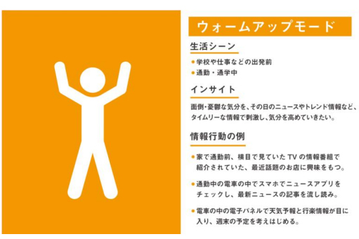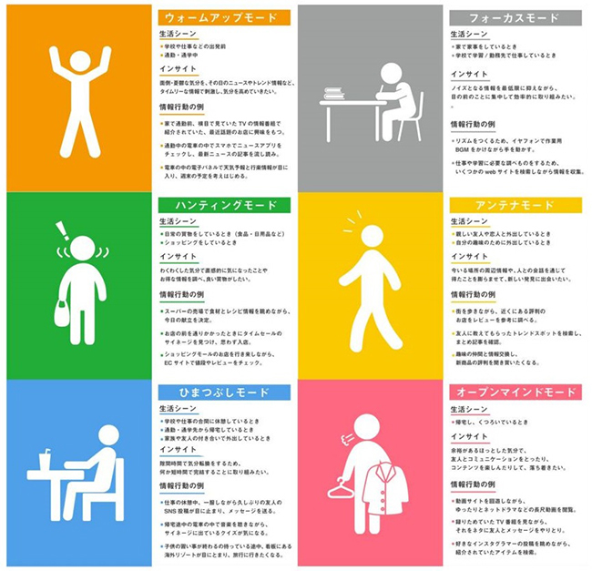 また、生活シーンに対応した意識や情報行動の分析結果から、生活動線上のロケーションと気分に応じて変わる「6つのモード(ウォームアップモード/フォーカスモード/ハンティングモード/アンテナモード/ひまつぶしモード/オープンマインドモード)」が浮かび上がったという。