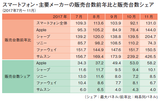 当のAppleは9月、10月と大幅な前年割れを喫したが、11月には144.0%と挽回。スマホ市場を押し上げた。11月の販売台数上位メーカーのうち、ソニーモバイルを除く4社は、軒並み前年を大幅に上回っている。