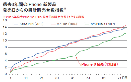 注目のiPhone Xは、発売以来、販売台数ランキングのトップを獲得。しかし発売から74日目の時点で、iPhone 8/8 PlusとiPhone Xを合わせた新iPhoneの累計販売台数は、2016年の7/7 Plus、15年の6s/6s Plusと比べ、1割以上も下回っている。