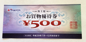 2016年度、業界売上高1位のヤマダ電機の株主優待の内容は、「100株以上500株未満:優待割引券500円2枚(3月末)、4枚(9月末)」「500株以上1,000株未満未満:優待割引券500円4枚(3月末)、6枚(9月末)」「1,000株以上10,000株未満:優待割引券500円100枚(3月末)、10枚(9月末)」など。さらに、3月は、10株以上を1年以上2年未満継続保有(株主名簿に連続3回以上5回未満記載)の株主には3枚、2年以上(連続5回以上記載)の株主には4枚、優待割引券を追加する。売買単位は100株。権利確定月は3月末日・9月末日。