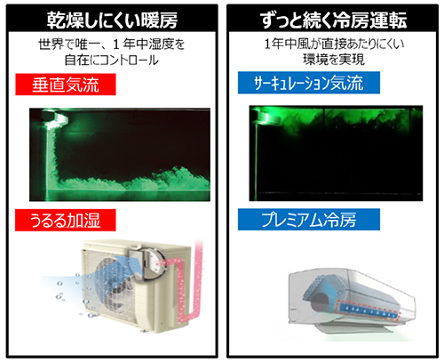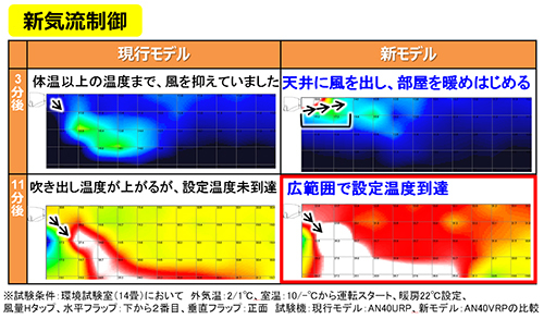 「新気流制御」では、暖房運転スタート時に「サーキュレーション気流」とルーバーを使って、天井に沿うように風を送り出すようにした。従来は暖房立ち上げ時に下向きに風を送っていたため、直接、身体に風があたって寒く感じてしまわないように、風が体温以上の温度に到達するまで風量を控えて運転していた。ちょろちょろと弱い風を送り出すため、温度が上昇するまでに時間を要していたのだ。
