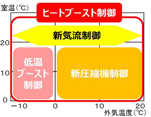 「ヒートブースト制御」は、室温と外気温の違いによって機能する「新気流制御」「新圧縮機制御」「低温ブースト制御」の3つの制御技術から構成される。とくに「新気流制御」と「新圧縮機制御」の2つは、暖房の設定温度に到達するまでの時間を、従来の14分から11分に20%短縮させた技術だ。