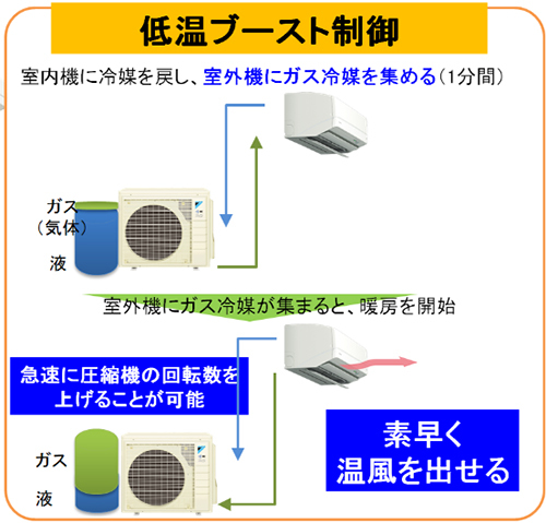最後の「低温ブースト制御」は、外気温が0度からマイナス10度になる環境で力を発揮する。外気温が低いと室外機にたまっている冷媒は冷たくなり、気体から液体に変化した冷媒の比率が高まる。液体の冷媒ではコンプレッサは運転できないため、冷媒をゆっくりと気体にさせながら運転する。このときの時間が長引くほど、暖まる時間も長くなる。