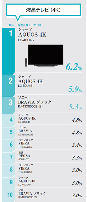2017年10月のピックアップカテゴリは、「ドライブレコーダー」「ゲーミングキーボード」「ゲーミングマウス」「SIMフリースマートフォン」「ノートPC」「4K液晶テレビ」の6つ。「4K液晶テレビ」は、前月と変わらず、シャープの「AQUOS 4K」のUSラインの45型「LC-45US40」、50型「LC-50US40」が1位、2位に続きました。4K液晶テレビ