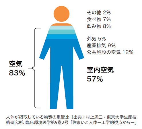理屈はシンプルで、空気が常に循環している外とは異なり、室内は空気が同じ場所に留まりやすい。滞留すれば、それだけ汚れも蓄積されやすくなる。東京大学生産技術研究所の村上周三氏によると、人間が摂取する物量の約6割は室内の空気が占めているそうだ。健康のことを考慮するなら、飲料水以上に室内空気をキレイに保つ必要があるのだ。
