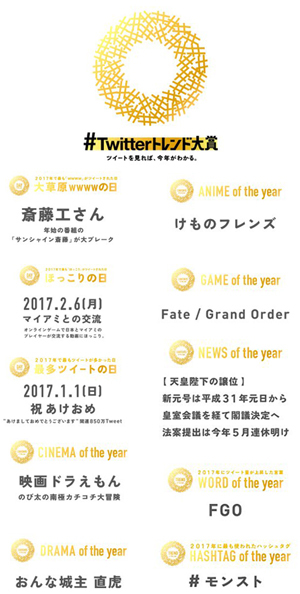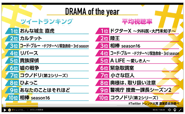 「#Twitterトレンド大賞」は、年間で最もツイート数が多かった日「デイ・オブ・ザ・イヤー」をはじめ、「エンタメコンテンツ・オブ・ザ・イヤー」「トレンド・オブ・ザ・イヤー」「リツイート・オブ・ザ・イヤー」の4部門で構成。「エンタメコンテンツ・オブ・ザ・イヤー」では、1月1日~11月30日のツイート数やリツイート数から算出した「話題量」をもとに、映画やアニメなどジャンルごとに作品を選出し、年間で最も話題量が多かったドラマ作品「DRAMA of the year」には、17年にツイートされたテレビ番組関連ハッシュタグで5位だったNHKの大河ドラマ『おんな城主 直虎』が輝いた。