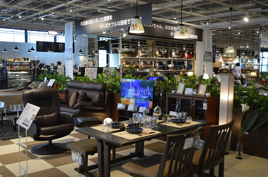 販売員の制服も、黄色のシャツと黒色のベストのおなじみのものではなく、青のポロシャツに黒いエプロンという初めて目にするスタイルだ。リフォームと家具に特化した3階は、「料理と家事を楽しむ二世代家族のコミュニティ住空間」や「おじいちゃん、おばあちゃんがゆっくり寛げる快適空間」などとテーマを設定し、部屋のコーディネートを丸ごとレイアウトしたシーンを提案する。カフェスペースも併設するなどラグジュアリな空間になっている。
