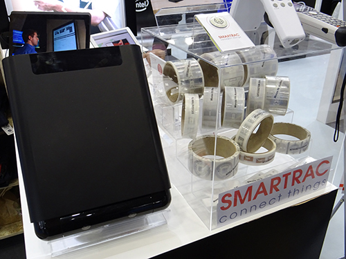 インテルと協業するSMARTRACは、壁や天井に設置したリーダー(左)でタグを読み取り、
