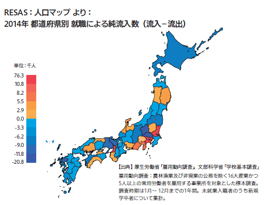 「RESAS」の人口マップから、2014年の「新卒者就職・就学」の人口移動データをみると、就職による流入数から流出数を差し引いた「純流入」は、東京都、茨城県、大阪府などの一部を除いて軒並みマイナスだ。就職・進学それぞれについて、流出率、流入率をみると、おおむね正反対の傾向にあり、人口集中地域とそうではない地域の差が鮮明になっている。