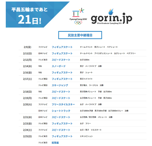2月9日に開幕する平昌冬季五輪。開催地の韓国・平昌(ピョンチャン)と日本の時差はなく、NHKや民放各局ではリアルタイムで競技を中継する予定。また、民放5局は、共同で動画配信サイト「gorin.jp」を立ち上げ、一部の種目を除き、ほぼすべての競技をライブ配信する。