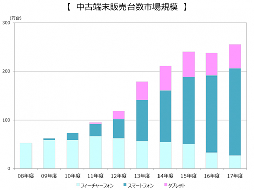 2016年度(4月~3月)の中古携帯端末の販売台数は約238万台(前年度比98.8%)で、そのうち主力となるスマホは約158万台(113.7%)だ。17年度では全体で256万台(106.4%)、18年度には308万台に達するとみられる。市場動向としては、09年~15年度は右肩上がりの成長を続けたが、16年度は足踏み、17年度ではわずかな成長を遂げると見通す。