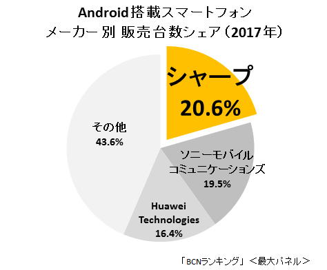 高木健次部長は「『AQUOS R』以降の『AQUOS』シリーズは、今までの製品の考え方とまったく違う」と力強く語る。全国の家電量販店の実売データを集計した「BCNランキング」によると、2017年のAndroid搭載スマートフォンのメーカー別販売台数1位はシャープ。シェア20.6%を占め、年間1位に輝いた。新たに購入したユーザーからは「2年間・最大2回のOSバージョンアップがうれしい」や、AQUOS専用アクセサリのパッケージを統一したことで「アクセサリが見つけやすくなった」といった声が寄せられているという。豊富なカラーバリエーションも好評だ。
