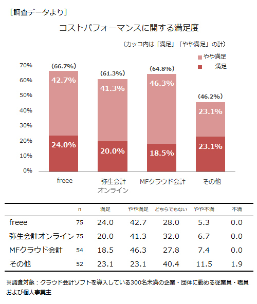 インタビューの中で、九段会計事務所が早期に多数の導入実績を獲得できた理由として、クラウド会計ソフトのさまざまなメリットが挙げられていた。加えて、導入にあたって多くの経営者が最も気にするポイントは「コストに見合う効果が得られるのか」だろう。大手3サービスのユーザーはその6割以上が「満足」「やや満足」と答えており、中でもfreeeがコストパフォーマンスについて最も高い評価となっている。一方、大手3サービス以外のユーザーによる「その他」の回答では、「満足」「やや満足」の計は半数未満となっており、若干ではあるが不満の声も多くなっている。