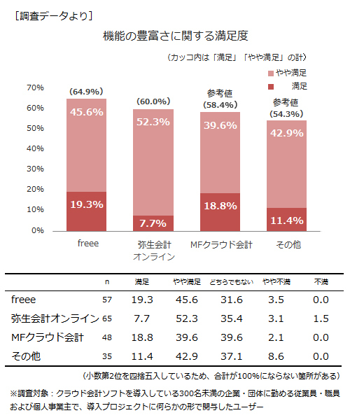 クラウド会計ソフトの導入に関与したユーザーに、機能面の豊富さに関して満足度を尋ねたところ、freeeが「満足」および「満足+やや満足」の回答でトップとなった。同社が掲げる、さまざまな機能をオールインワンで利用でき、経理業務全体を効率化するという“クラウドERP”のコンセプトに満足する人が多いようだ。