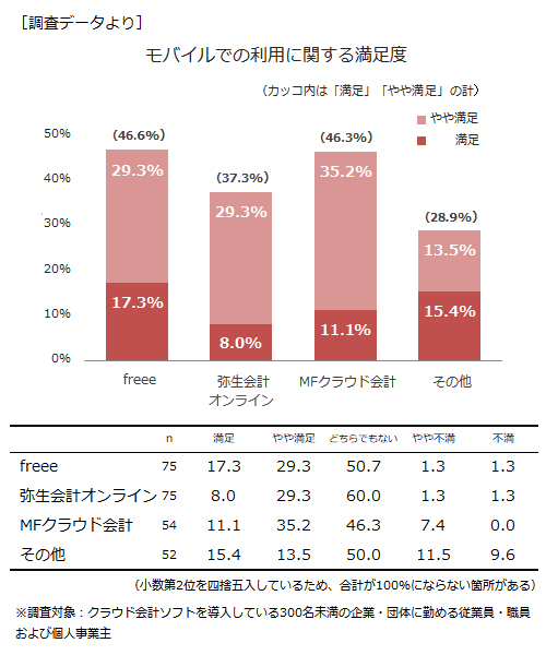 「満足」「やや満足」の回答はfreeeとMFクラウド会計のユーザーに多く、特にfreeeは「満足」の比率が最も高くなっている。