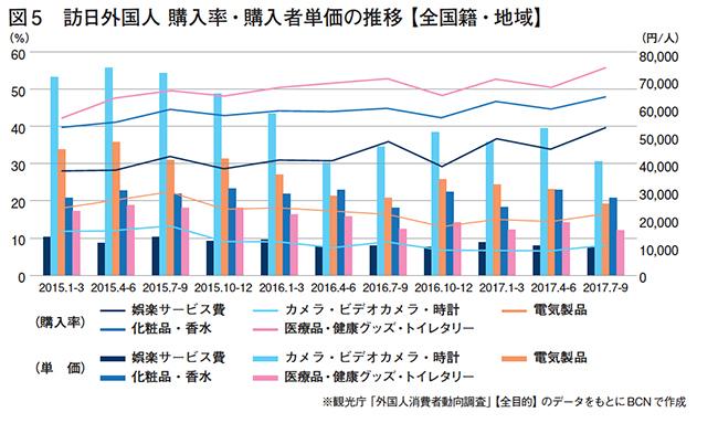 全国籍・地域を含む種類別の購入率・購入者単価率の推移(図5)では、衣料品・健康グッズ・トイレタリーと化粧品・香水、そして娯楽サービスが人気ジャンルだ。購入率に注目すると、前述の3項目は成長しているが、相対的に単価が高いカメラ・ビデオカメラ・時計や電気製品は伸び悩んでいる。娯楽サービス費の購入率の伸びについて、観光庁 観光戦略課 観光経済調査室の赤井久宣室長は「この流れは今後も続いてほしい」と語る。「コト消費」を増大させて訪日外客がさらに増えれば、連動して物品購入への波及効果が期待できるからだ。その際、手間なくスマートに買い物ができる仕組みを整える必要がある。