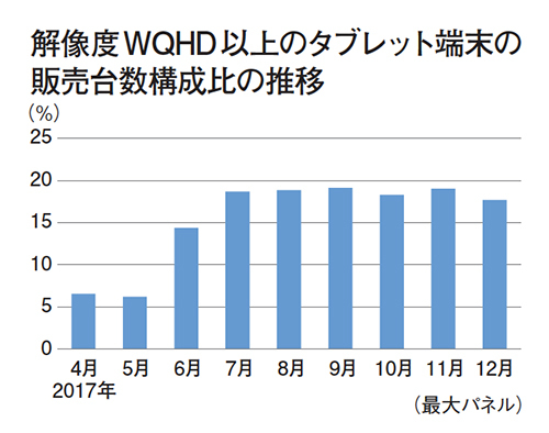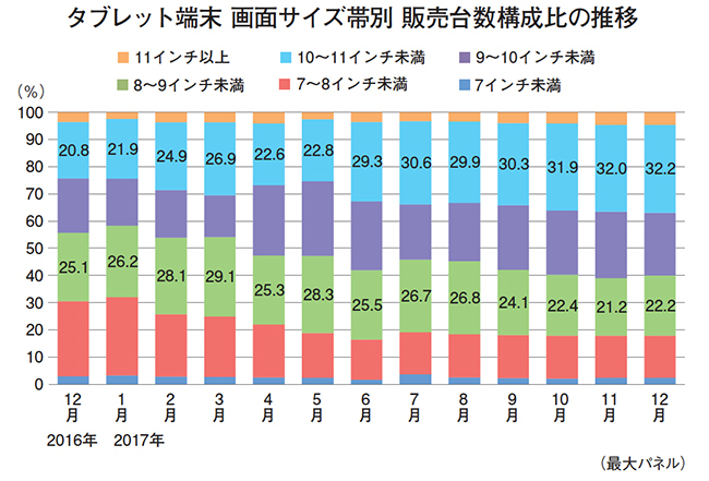 また、タブレットは、15年にアップルが12.9インチのiPad Proを発売して以来、ジリジリと大型化が進んでいる。直近の17年12月でも、画面サイズ11インチ以上の大型モデルとなると、全体の5%に満たないが、16年に4割強の水準だった9インチ以上の割合は、17年末には6割を超えるまでに拡大している。