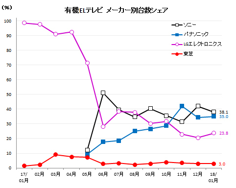 全国の主要家電量販店・ネットショップの実売データを集計した「BCNランキング」の販売台数シェアの推移からも、ソニーの有機ELテレビの好調さが読み取れる。6月の発売開始すぐに、それまで1位だったLGエレクトロニクスを抜き、50%を超すシェアトップに躍り出た。その後、パナソニックが11月に単独首位に立つが、12月にソニーが再び首位を奪還。1月から12月の年間販売台数シェアでNo.1の座を仕留めた。18年1月の直近でも38.1%で首位だ。