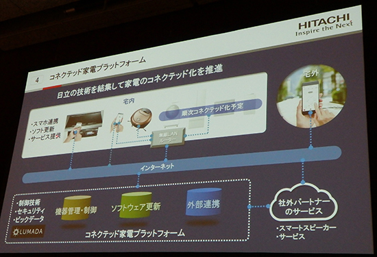 プラットフォームでは、「コネクテッド家電」がインターネットを介して、日立のIoTプラットフォームである「Lumada(ルマーダ)」や Amazonのクラウドベースの音声サービス「Amazon Alexa」に対応したスマートスピーカーなど、外部パートナーのサービスと連携していく。Lumadaは、日立の家電だけに特化したものではなく、他社の家電製品ともつながるという。「コネクテッド家電をタッチポイントに、社外のパートナーと新たなサービスを提供していく」(徳永社長)。