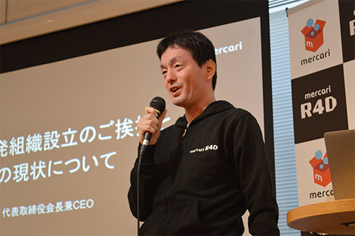 17年12月の記者会見でテクノロジー開発の強化案を語るメルカリの山田進太郎会長