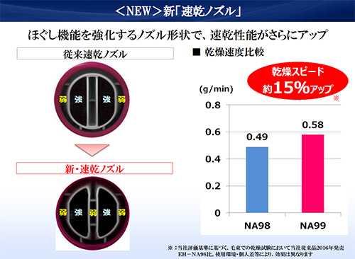 ポイントは髪の毛の乾燥と一緒に、髪質改善までケアできる点で、忙しい朝の「時短家電」という側面からプッシュできる。乾かすスピードでは、従来より約15%アップさせた「新・速乾ノズル」を搭載。吹き出し口の間隔のバランスを整えることで、風の強弱差を拡大。強い風と弱い風を同時に吹き出すことで、手ぐしでとくような作用が生まれ、髪をより速く乾かすことができる。