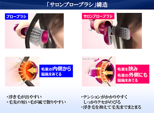 サロンブローブラシは、毛束を挟んで髪の外側にも温風をあてるためテンションがかかりやすくなる。和田主務は「ヘアドライヤーを使ったあとに、毛流れをしっかり整えてからブローする女性の間で使用が広がっている」と新社会人の身だしなみを整えるアイテムとして、ドライヤーとのセット提案をアピールする。