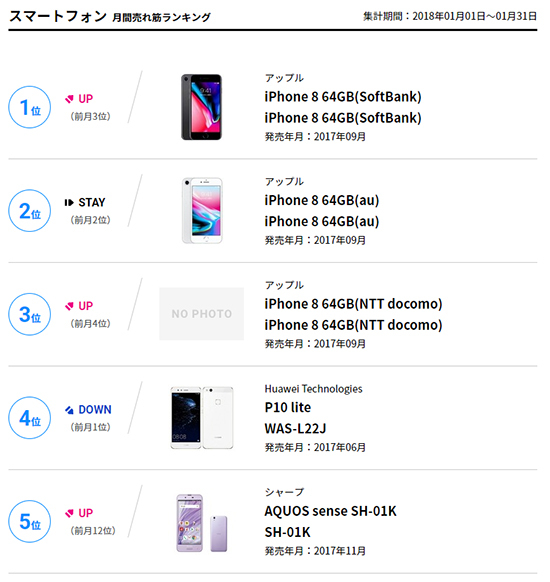 2018年1月のスマートフォン販売台数ランキング(1位~5位)