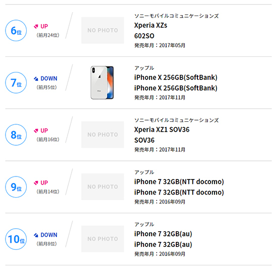 Top10のなかで「iPhone X」が登場するのは、7位のSoftBankの256GBモデルのみ。同時期に発表したiPhone 8と比べると、iPhone Xの不振を裏付ける結果になった。9位、10位、11位には「iPhone 7」が続く。