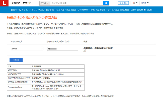 無償点検の対象となるのは当該期間に製造された同機種で、マシンタイプが「20HQ」「20HR」「20K3」「20K4」のうち、一部の製品。同社では、対象製品かどうかの判別ができるウェブサイト(https://support.lenovo.com/jp/ja/solutions/ht504453)を開設しており、ユーザーは製品底面などに貼付されているシリアル番号(S/N)を入力することで、自分の製品に影響がおよぶかを確認することができる。