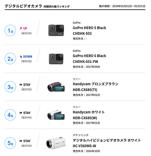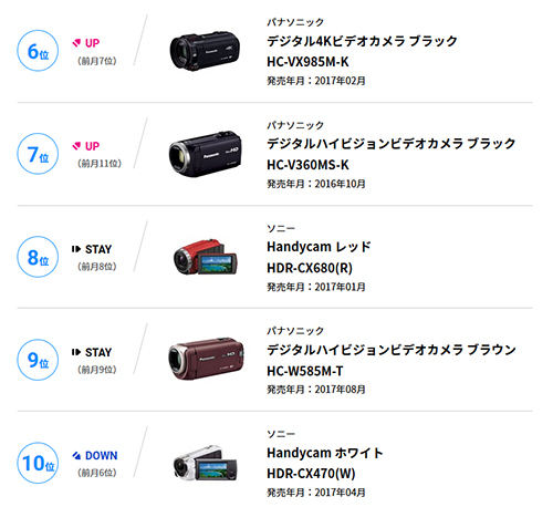 2018年1月のデジタルビデオカメラ販売台数ランキング(6位~10位)