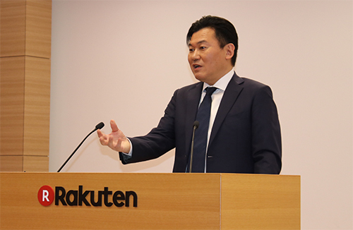 17年度通期決算について説明する三木谷代表取締役会長兼社長