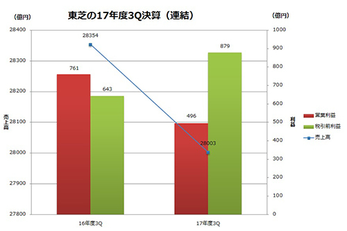 東芝が2月14日に発表した2017年度第3四半期(3Q、4月~12月)の連結業績は、売上高が2兆8003億3100万円(前年同期比1.2%減)と減収、営業利益が495億6900万円(同34.9%減)と減少したものの、税引前利益が878億8200万円(同36.6%増)と増え、四半期純利益(同社株主に帰属)が270億4200万円(前年同期はマイナス5325億1200万円)と黒字に転じた。