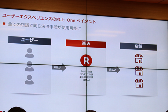 18年度中に順次導入していくのは「One ペイメント」。店舗と消費者の間に楽天が入って決済を仲介する仕組みだ。これまでは、コンビニ決済の可否や後払いの有無など、店舗ごとに決済方法が異なっており、複数店舗を利用するユーザーは支払方法をそれぞれにあわせる必要があった。一部店舗ではすでに実施しており、将来的にはどの店舗でもあらゆる決済方法で買い物ができるようになるという。