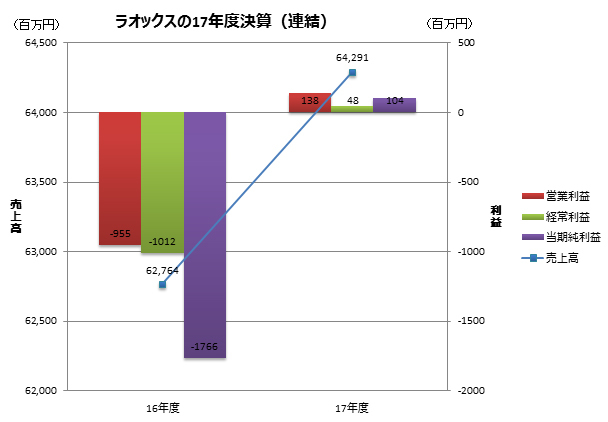 ラオックスが2月14日に発表した2017年度(17年12月期)の連結業績は、売上高が642億9100万円(前年度比2.4%増)と増収、営業利益が1億3800万円(前年度はマイナス9億5500万円)、経常利益が4800万円(同マイナス10億1200万円)、当期純利益(親会社株主に帰属)が1億400万円(同17億6600万円)と黒字に転換した。